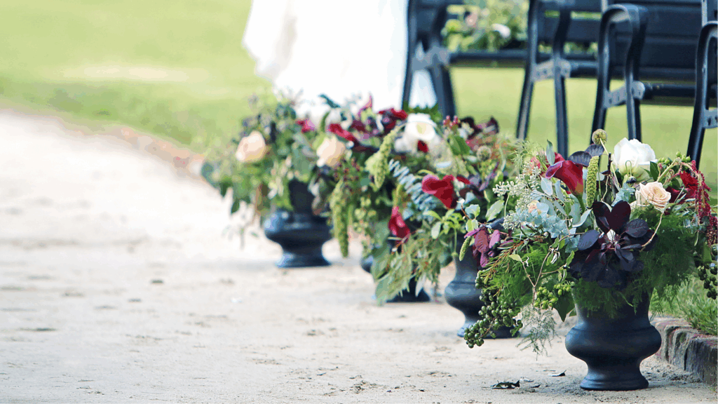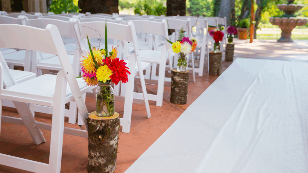 • Gangpadversiering: denk aan kleine vaasjes aan de zijkant, losse bloemblaadjes op de loper of bloemstukken die de route naar het altaar markeren.