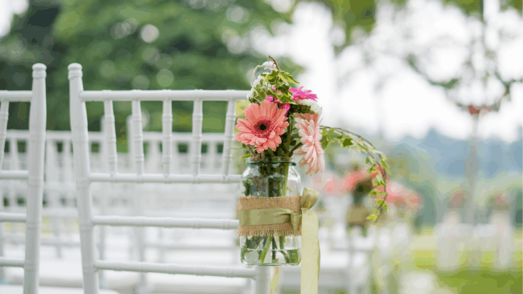 • Stoelversiering: bundeltjes bloemen of groen met lint, stijlvol bevestigd aan de stoelen van het bruidspaar of de gasten.