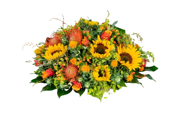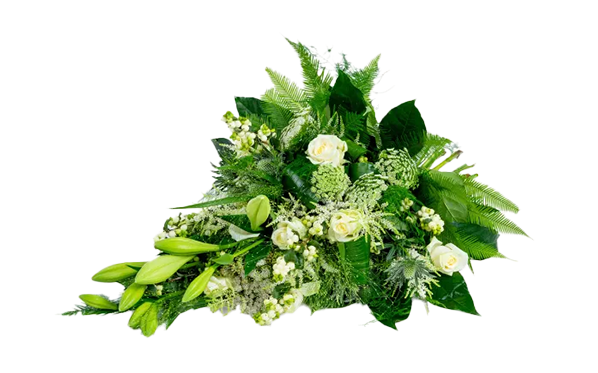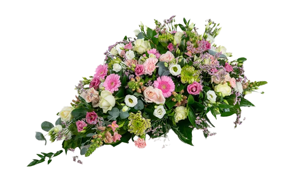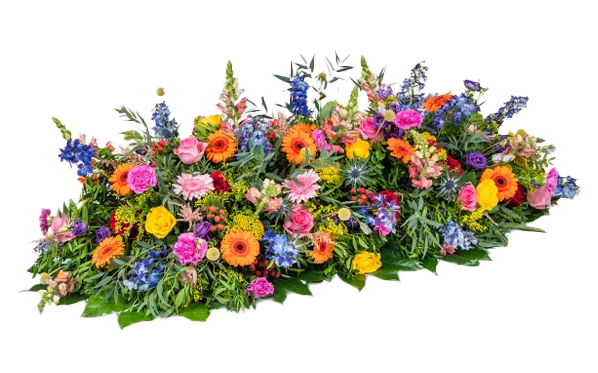 De kistbedekking wordt liggend op de kist geplaatst. Door de lengte en vorm is dit bloemstuk zeer geschikt om de kist op een kleurrijke en liefdevolle manier te omringen met bloemen.